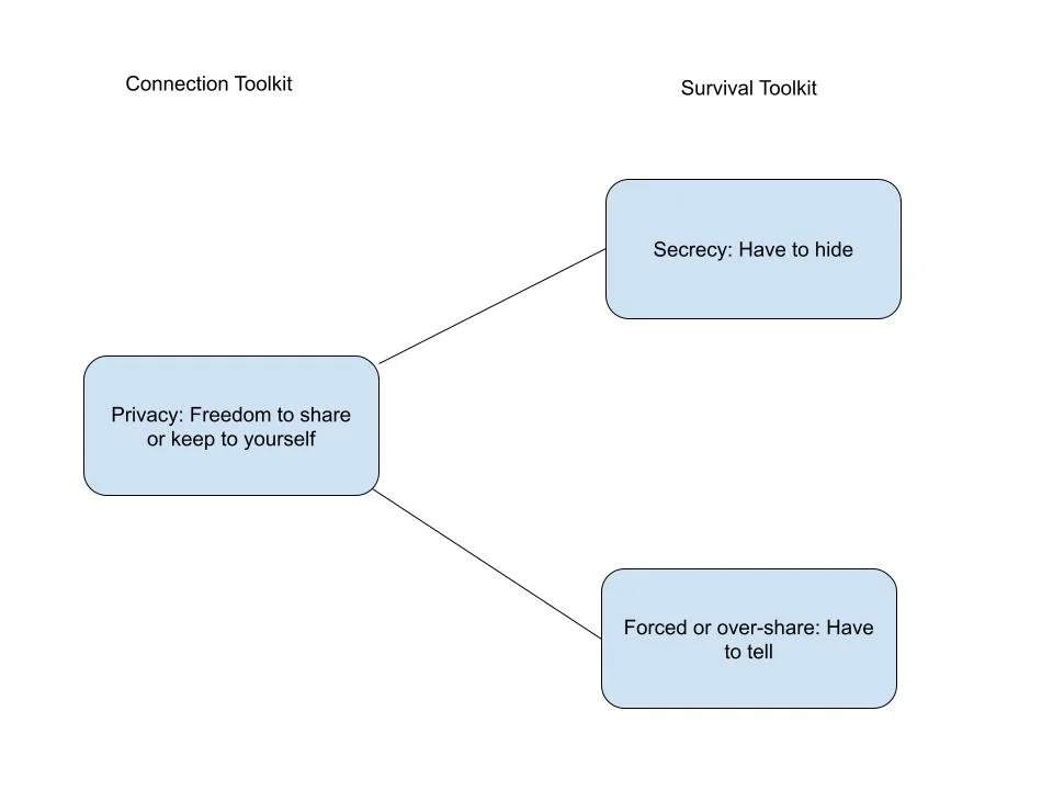 Secrecy is the feeling “I have to hide this. I can’t let anyone know.” It is part of what I call a “survival toolkit.” The survival toolkit is full of protective strategies that can be helpful in (emotionally) unsafe spaces. Why might we feel we have to hide something? If we fear judgment, if someone might weaponize the information to use it against us, if we don’t trust the person to treat that information kindly or justly. Fear and shame (rational or irrational) are present when we feel we have to hide.